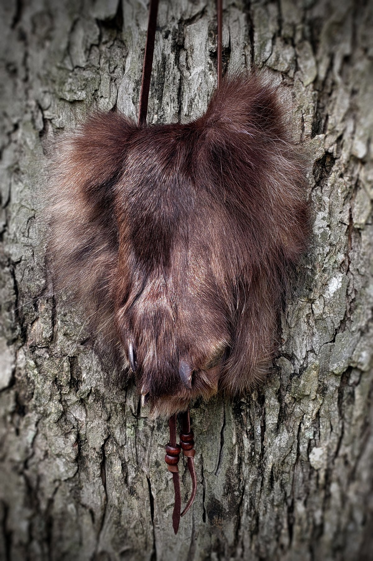 This hand-sewn bag is made from a black Canadian Wolf (Canis lupus) paw suspended from deerskin lace. This rear paw has pads and claws and is adorned with wooden beads to suit a variety of ritual, reenactment, or costume needs.