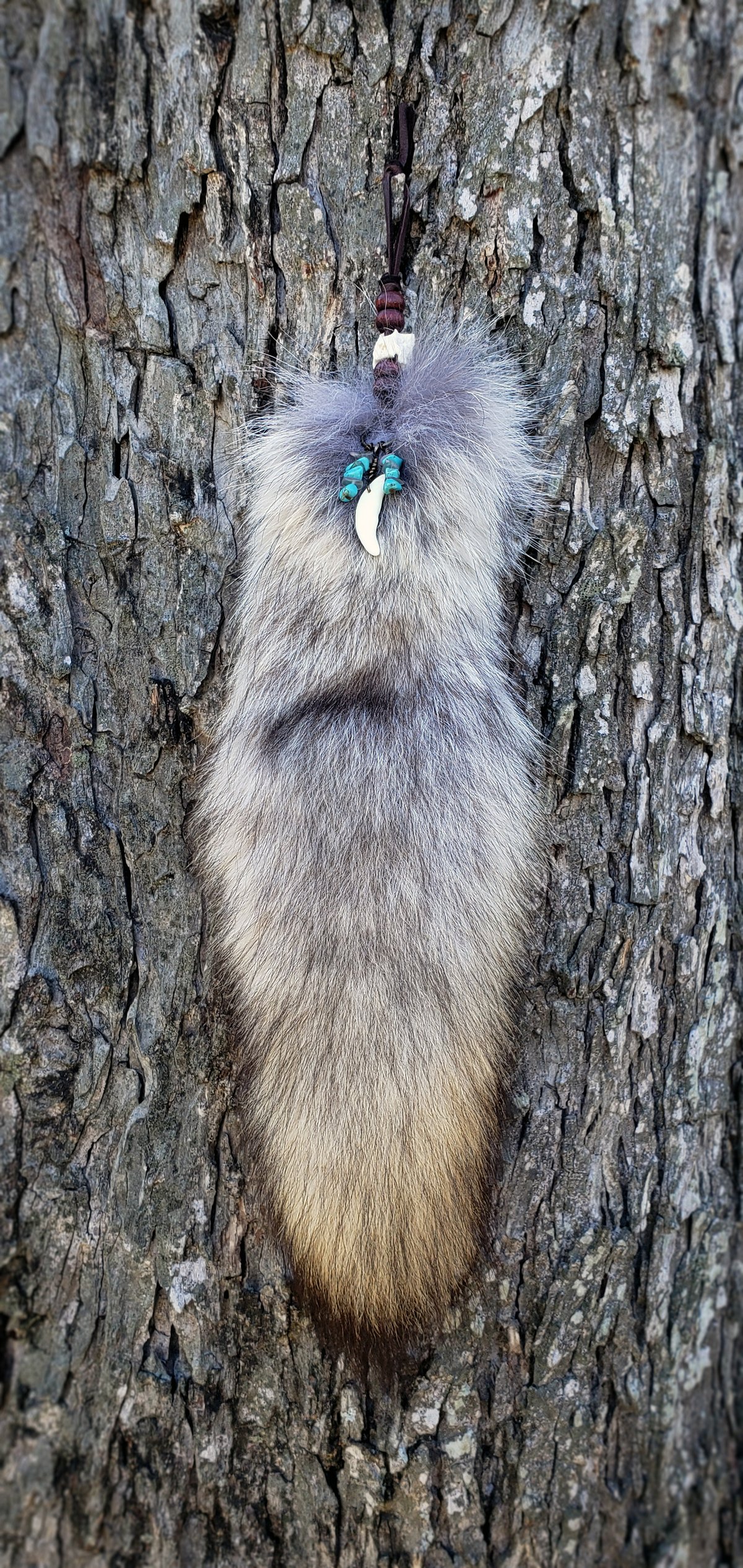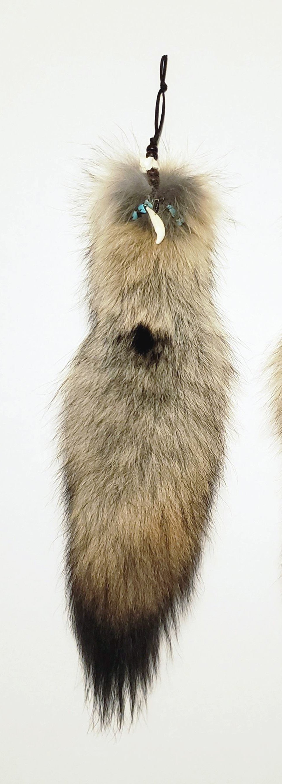 This genuine tanned Coyote tail is accented with turquoise and moonstone beads, a coyote tooth, and a roadkill opossum bone. These are decorative wall-hanger quality tails and not recommended for wear, but they will look lovely on your wall for years to come. Each is unique and will vary slightly. Last image shows the available tail.