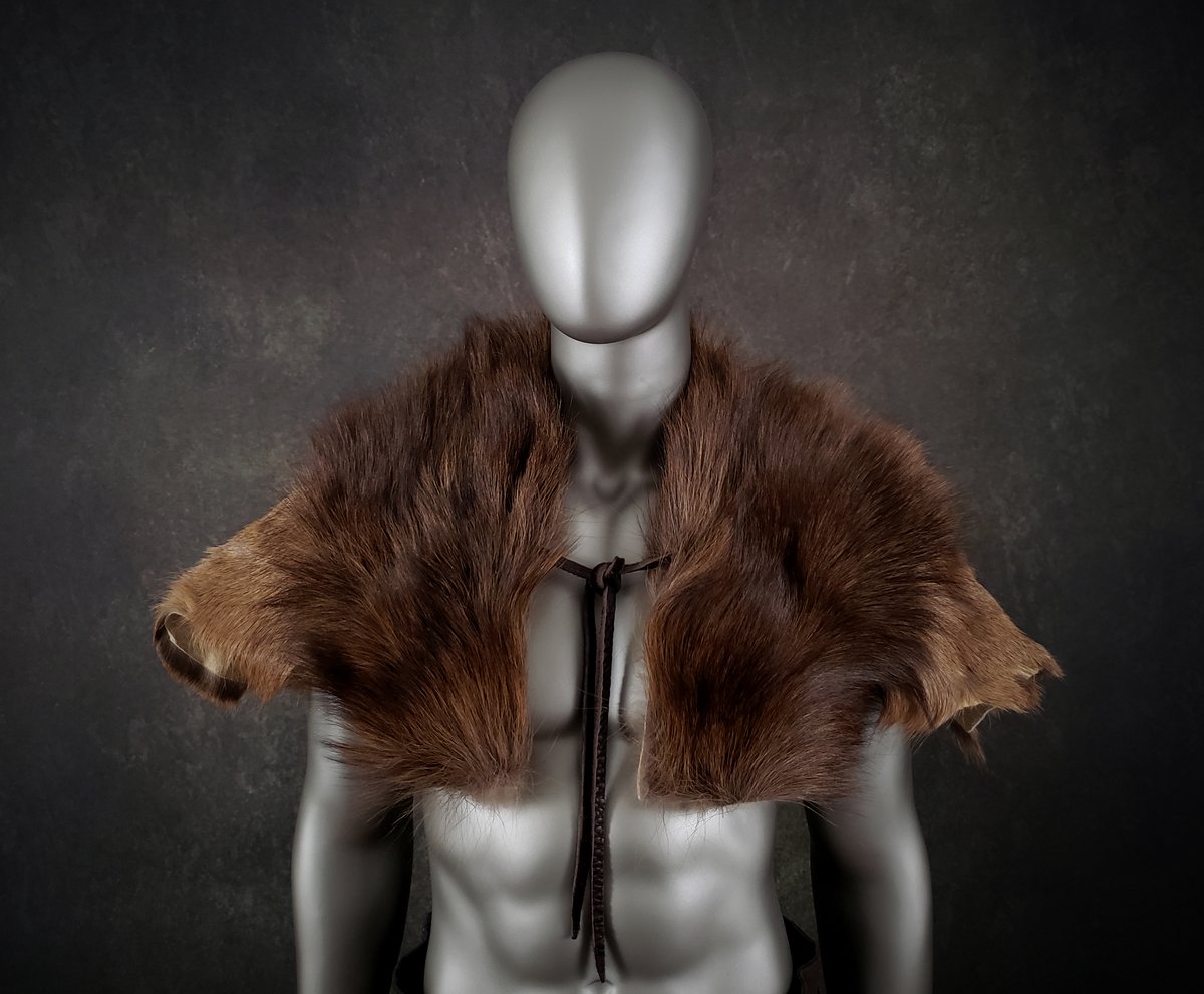 This garment is made from a tanned Elk hide and fastened with Bison leather ties. The mantle is unlined and would make an excellent accent to any garb. Color is light brown with a collar of longer dark hair. This skin is thick and of moderate weight, perfect for the battle-hard warrior or shield maiden! It does have some scattered spots where the hair is worn off, which only helps to give it a rugged look.