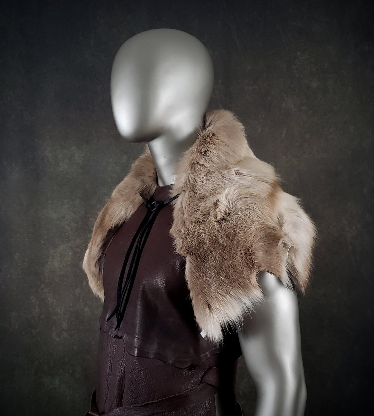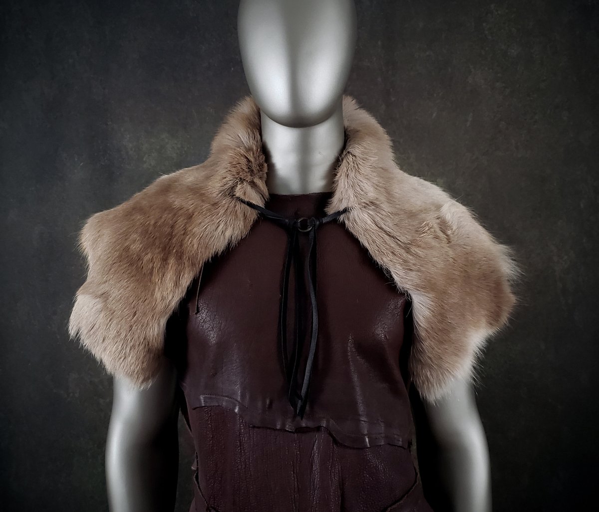 This genuine tanned fur garment is made from a remnant piece of Reindeer skin. Fur color is light brown with a pale border. It is fastened with leather ties and an ancient metal ring (a European artifact found via metal detector). Ties are adjustable on both sides. The mantle is unlined and is very lightweight. It would make a perfect accent to any garb.
