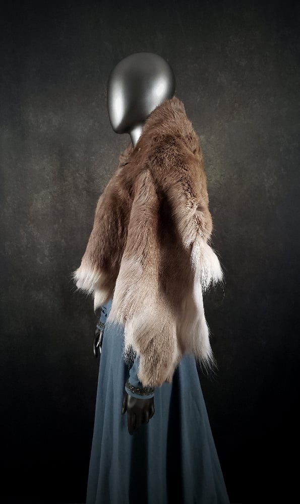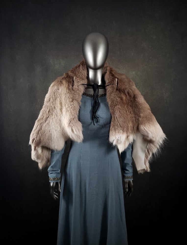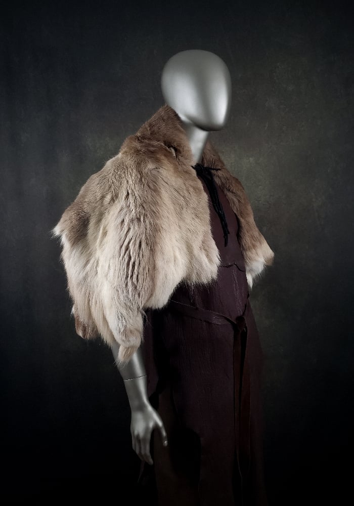 This genuine tanned garment is made of Reindeer skin, and has super soft brown and white fur. It is fastened with Moose leather ties, and accented with antler tips. The cloak is unlined and of light weight. It would make an excellent accent to any garb.