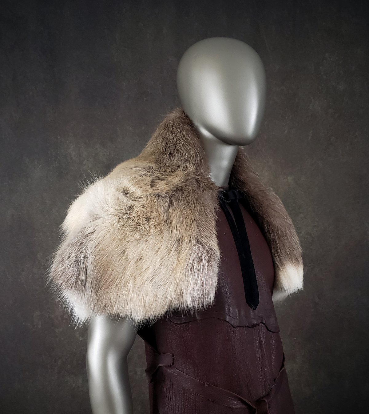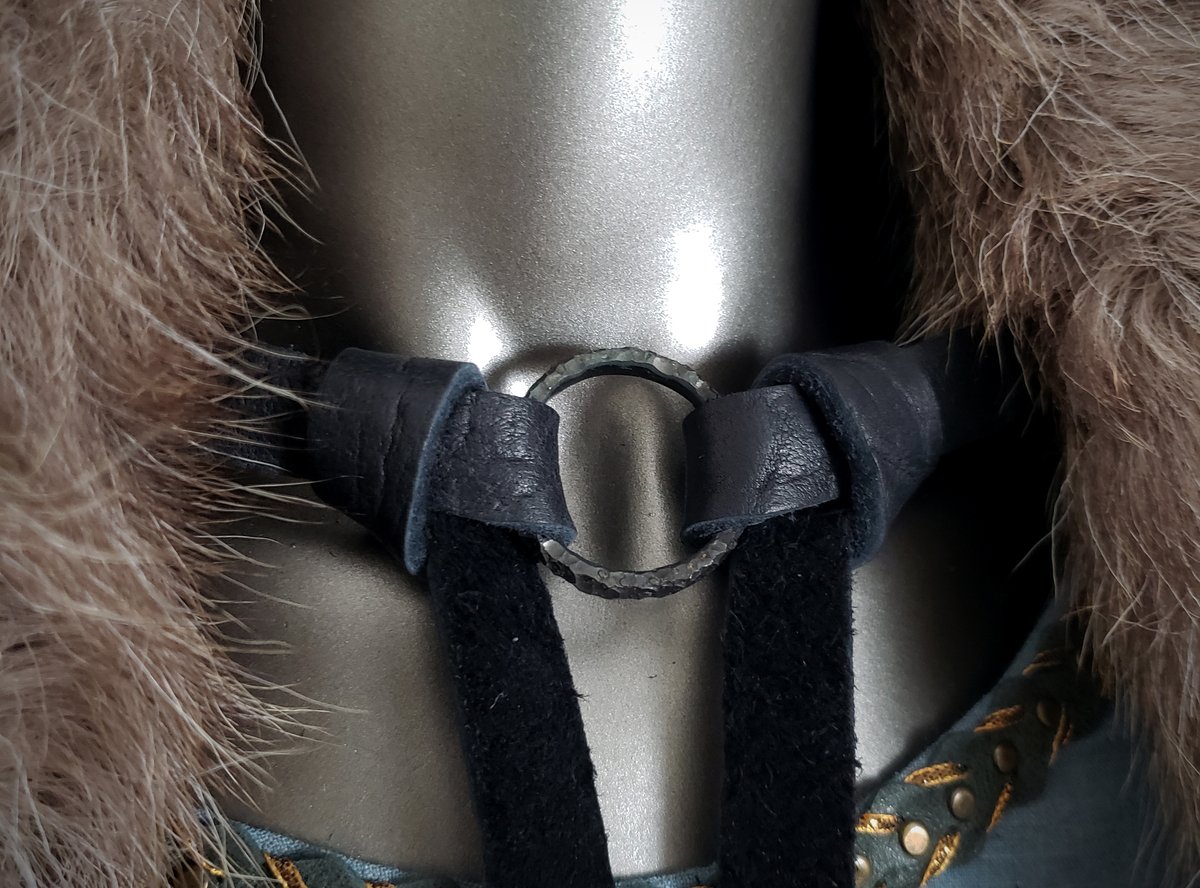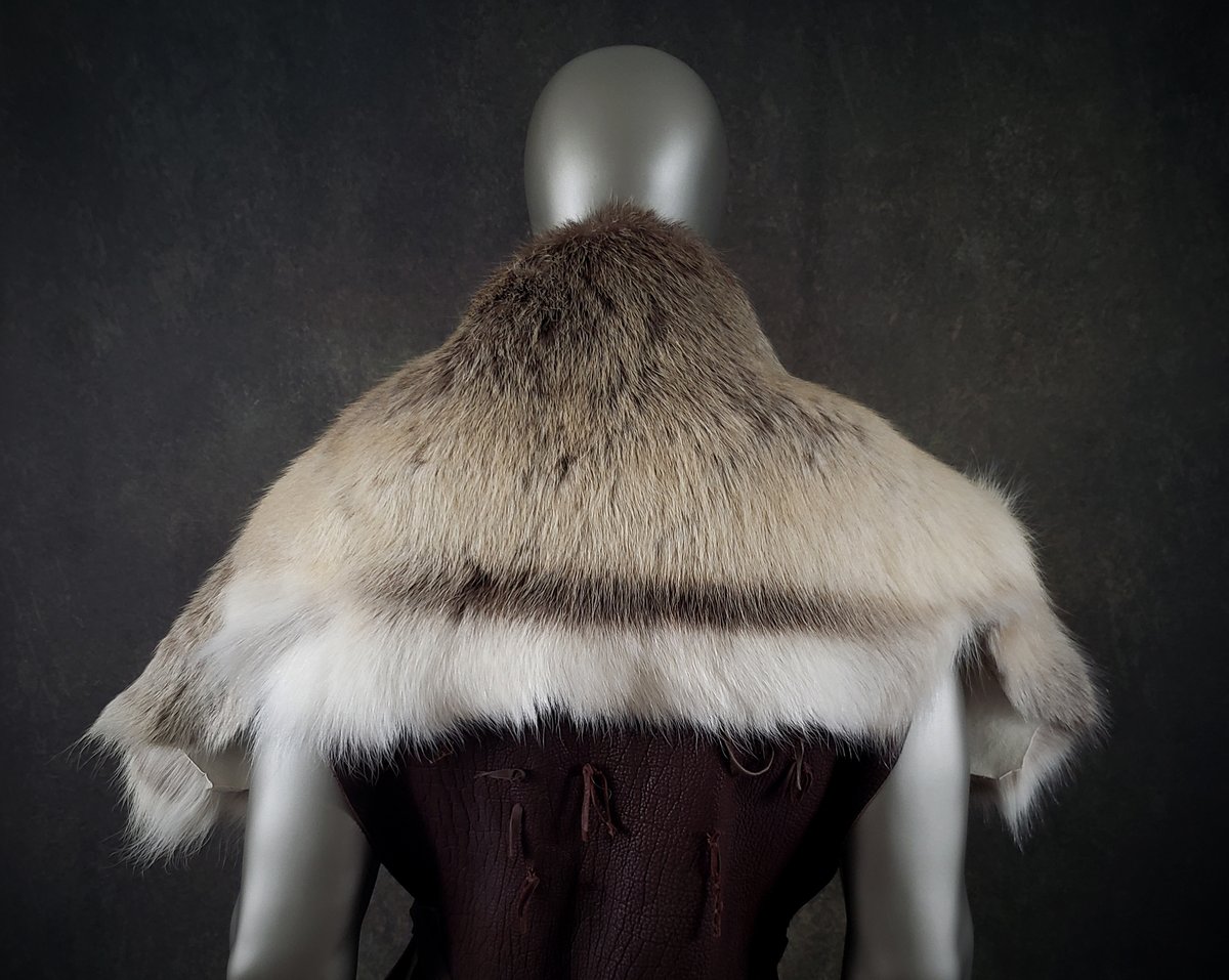 This genuine tanned garment is made of Reindeer skin, and has a mix of creamy tan and grey fur. It is fastened with Bison leather ties and a hand-forged iron ring. Ties are adjustable on both sides. The cloak is unlined and of medium weight. It would make a perfect accent to any garb.