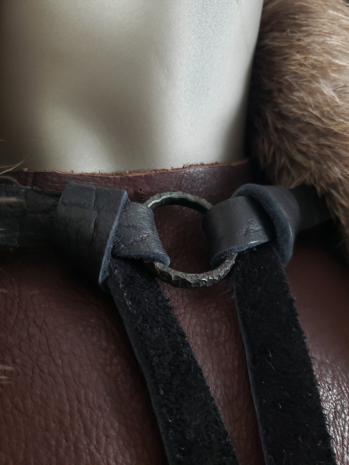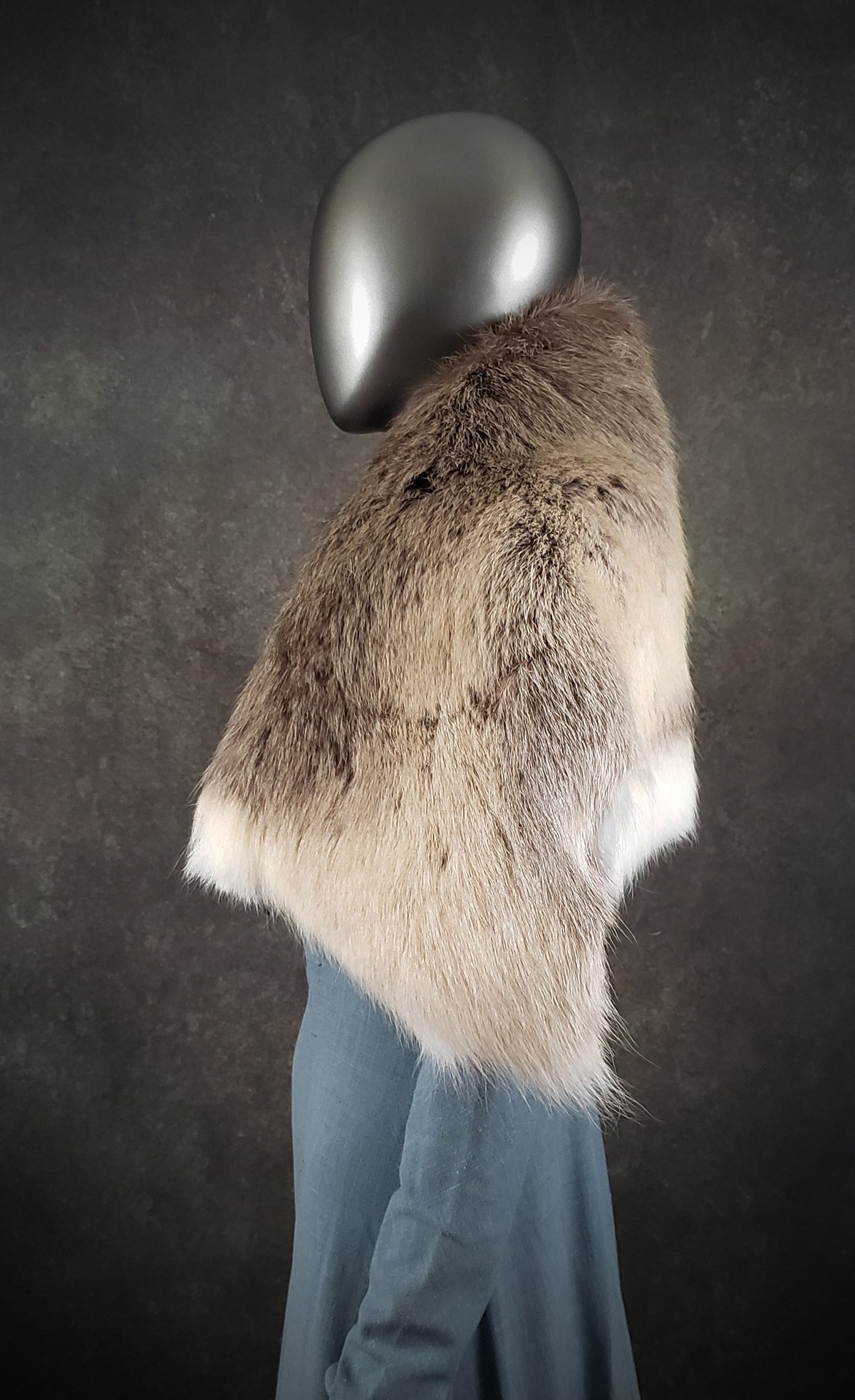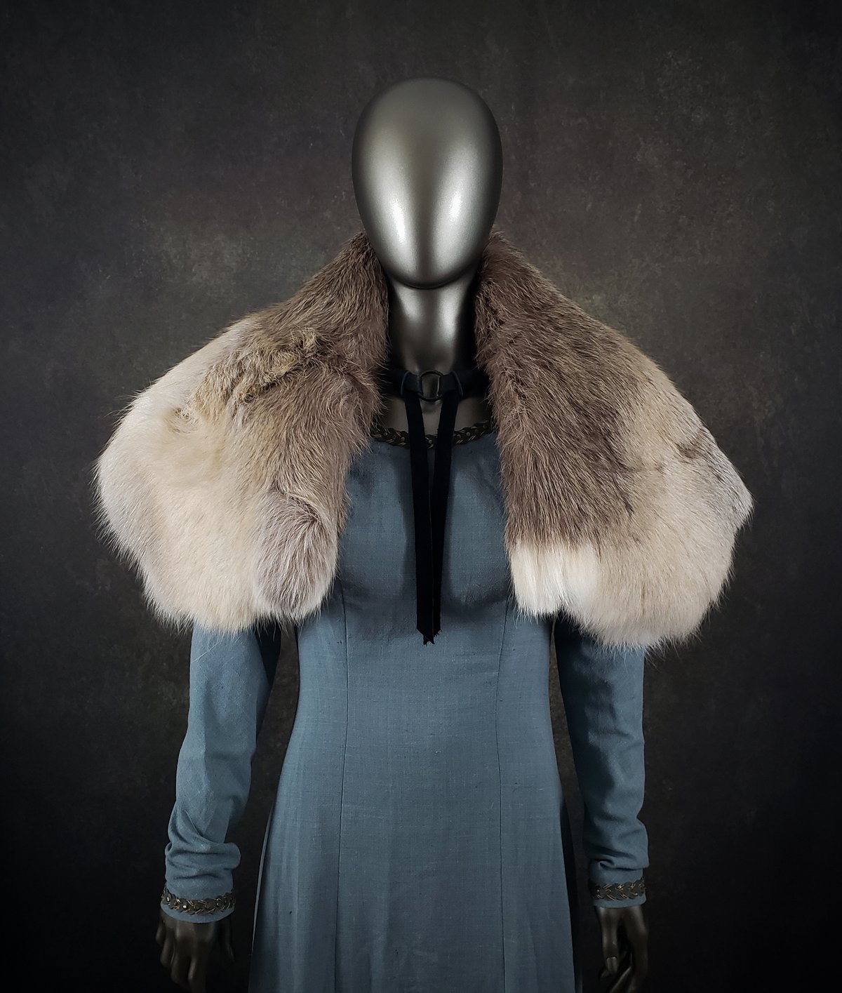 This genuine tanned garment is made of Reindeer skin, and has a mix of creamy tan and grey fur. It is fastened with Bison leather ties and a hand-forged iron ring. Ties are adjustable on both sides. The cloak is unlined and of medium weight. It would make a perfect accent to any garb.