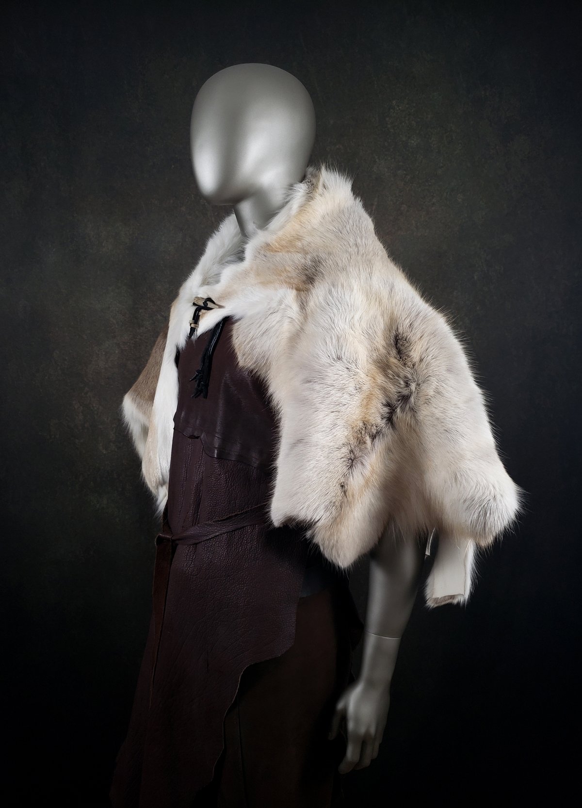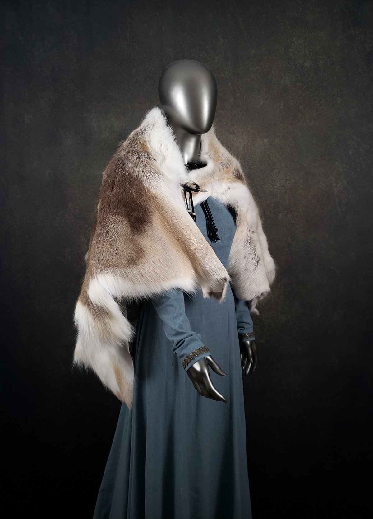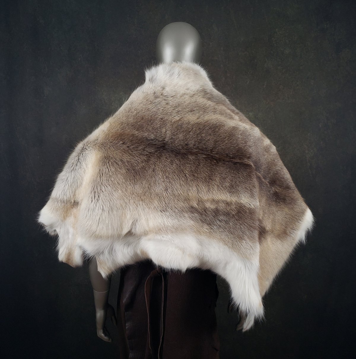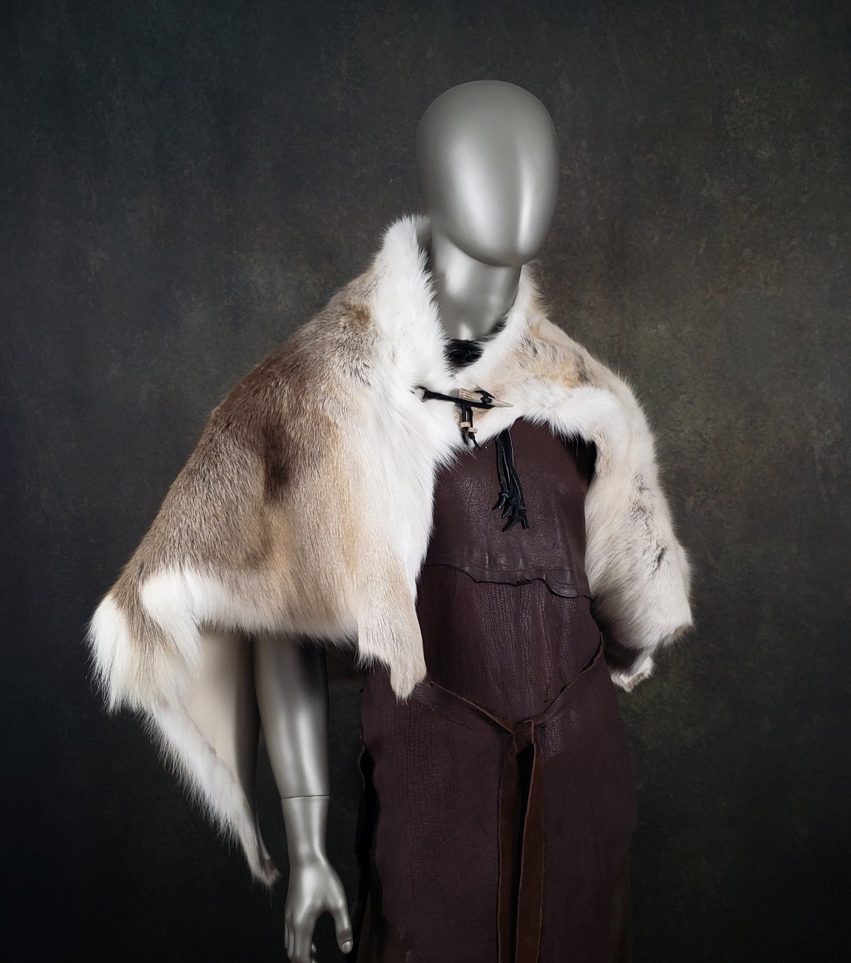 This genuine tanned fur cloak is made of a superior quality Reindeer skin, and is fastened with Moose leather ties, an antler tip, and an ancient metal ring (a European artifact found via metal detector, most likely an example of Celtic "ring money").