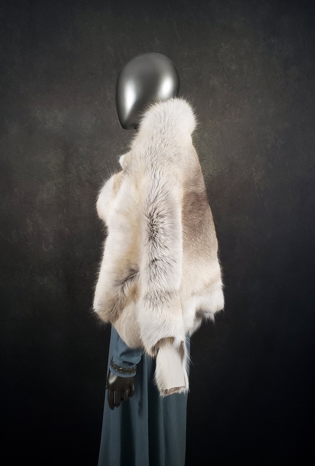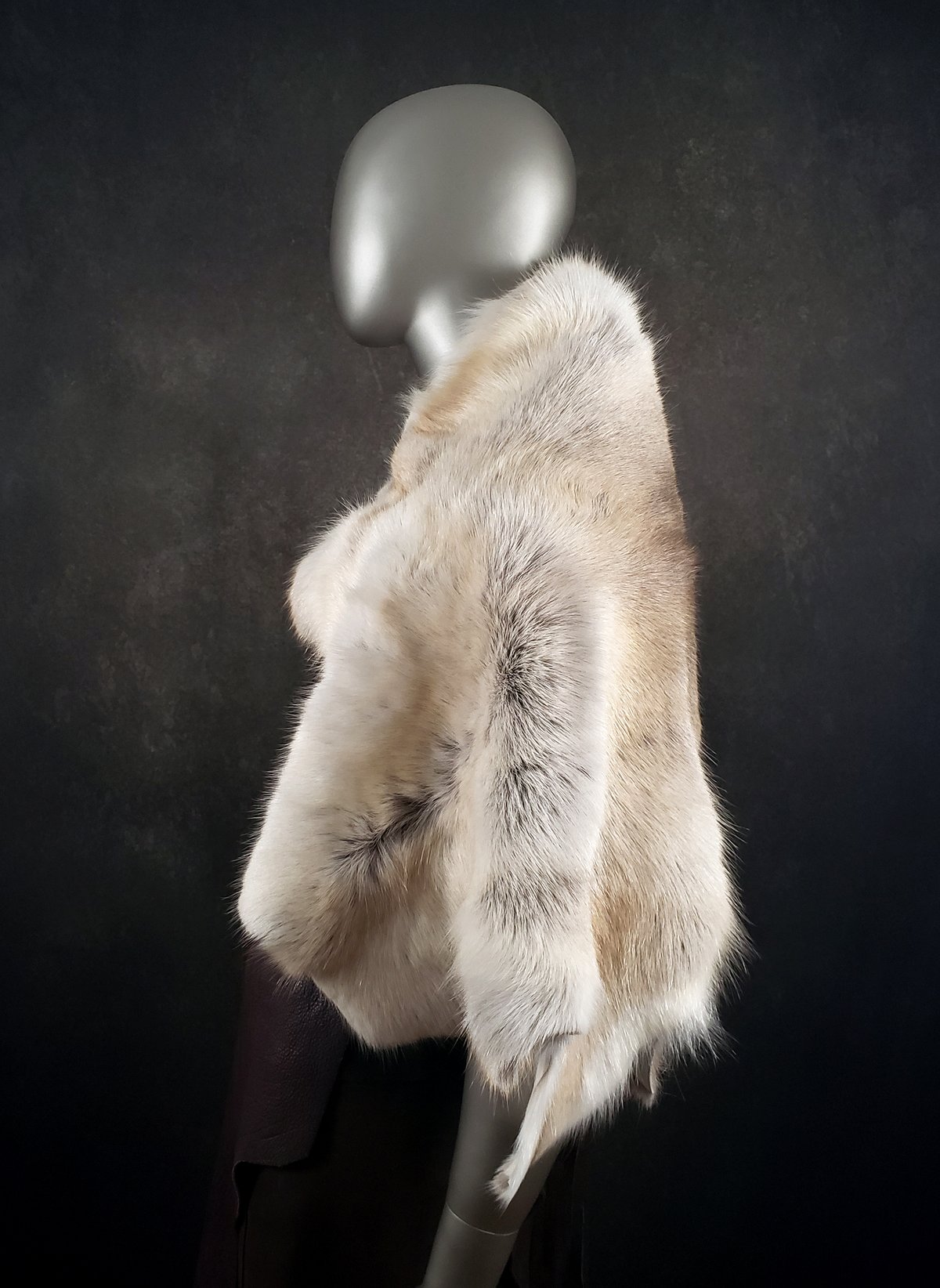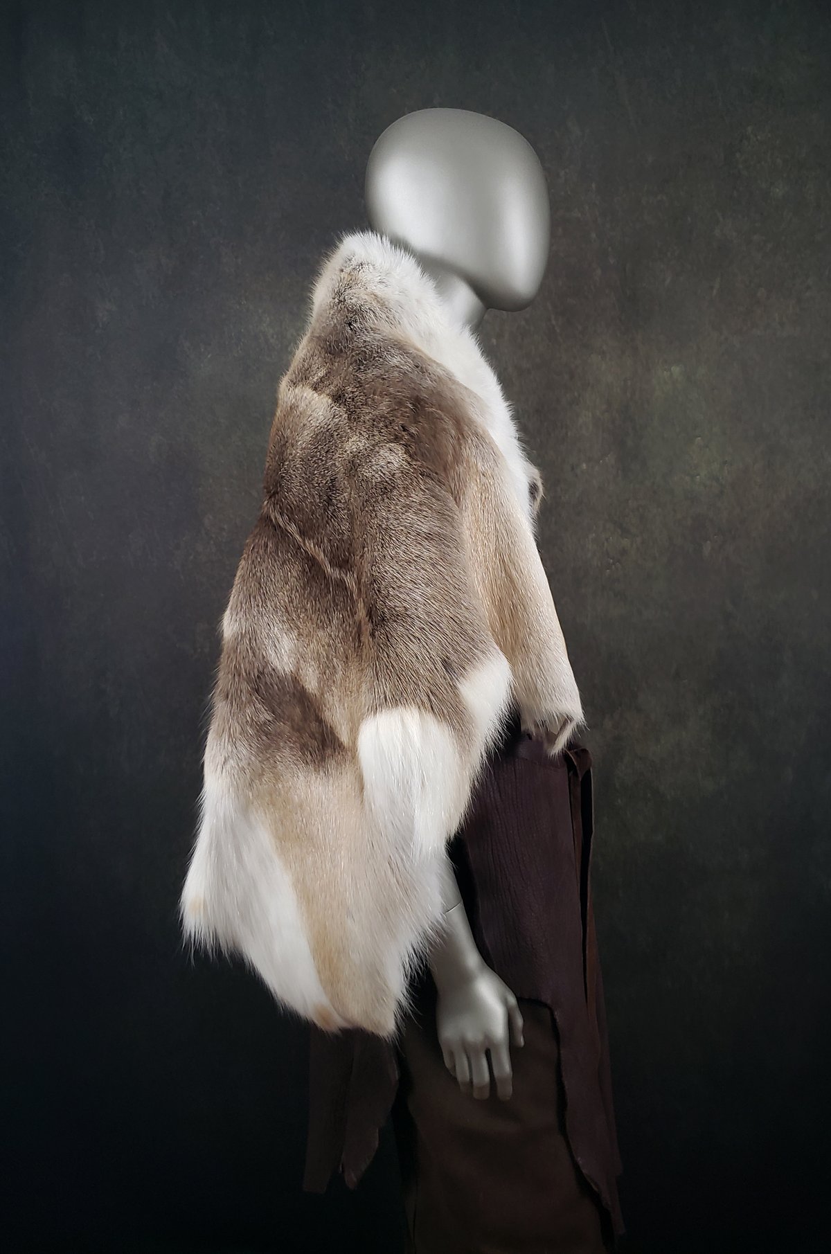 This hide has a beautiful blend of creamy tan, brown and white fur. The cloak is unlined and of medium weight. It would make a perfect accent to any garb.